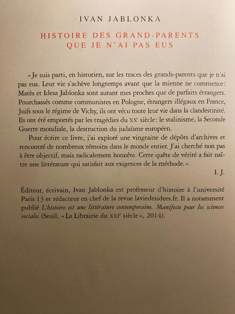 Je termine la lecture de votre bouleversante Histoire des grands-parents que je n’ai pas eus. C’est une magnifique leçon d’Histoire, au raz des Hommes. Votre quête de la vérité, contre l’oubli et le silence, sur les traces de Matès et Idesa Jablonka, nous permet de mieux percevoir le présent et l’insaisissable poursuite du passé rongeant l’avenir.
